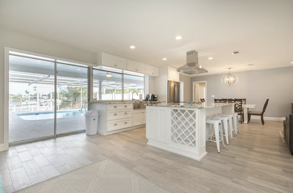 Опуштете се на опуштено место за одмор на брегот во сончевата плажа Аполо. Овој модерен, удобен дом ја спојува удобноста со крајбрежниот шарм, совршен за парови, семејства, снежни птици и работници на далечина кои сакаат да се опуштат, да се наполнат и да го впијат сонцето на Флорида. Влезете низ влезната врата до неверојатен поглед на вода, базен и ведрата убавина на каналот, поставувајќи го тонот за мирен престој. Пијте го утринското кафе во приватниот поплочен двор или опуштете се покрај надворешниот камин додека сонцето заоѓа над водата.