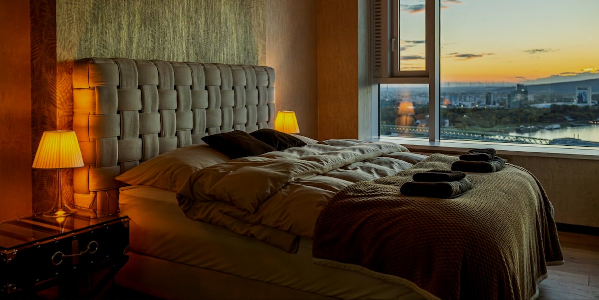 Добре дојдовте во прекрасното Небесно гнездо, кое се наоѓа на 22 кат – вашето луксузно живеење во кулата Eurovea! Овој целосно опремен стан со една спална соба е највисоката и најпрестижна зграда во Словачка и секоја вечер има неверојатни зајдисонца (бесплатно). Се наоѓате во срцето на Братислава, со директен пристап до трговскиот центар Eurovea, што значи дека шопингот, храната и прошетките покрај реката се во основа вашиот нов ходник. Ви се допаѓа вечер за состанок? Мрзлив бранч? Продавница за намирници во влечки? Покриени сте.