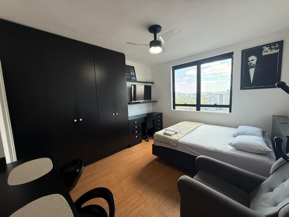 Мини студио комплетно во „Vilinha“ Ќе ја имате целата удобност со стандарден двоен кревет, тавански вентилатор, клупа со тапацир, трпезариска маса и компјутерска плотна. Комплетна кујна со индукциски шпорет, минибар и прибор за готвење Wi-fi и паметен телевизор 32 инчи Во близина на центарот на Џундијаи и главните автопати (Anhanguera и Bandeirantes) 300 милиони од Jundiaí School of Medicine. Немаме гаража, но има места на улицата