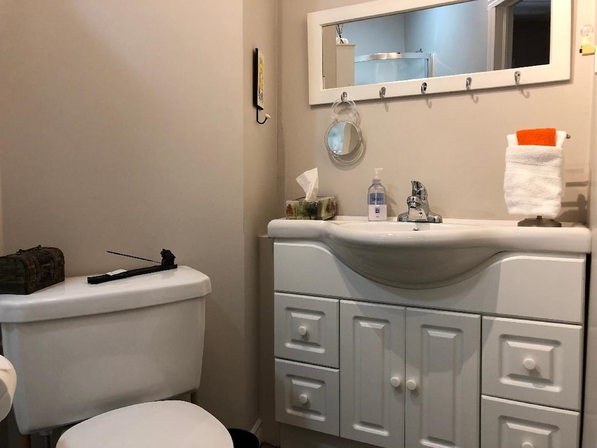 Добре дојдовте во нашиот светол и удобен студио апартман. Од суштинско значење за сите удобности, како што се ресторани, шопинг, казино, скијачки ридови и пристап до границата со САД. Нашата единица вклучува: 1 брачен кревет (двоен воздушен душек може да биде обезбеден со надоместок), простор за седење, бања од 3 дела, телевизори со 3 услуги за стриминг, кујничка со индукциона рингла и тави, фритеза/тостер рерна, микробранова печка, садови, основни удобности за готвење, кафе и чај бар, грицки/предмети за појадок, места за седење на отворено и бесплатен паркинг за 1 возило.