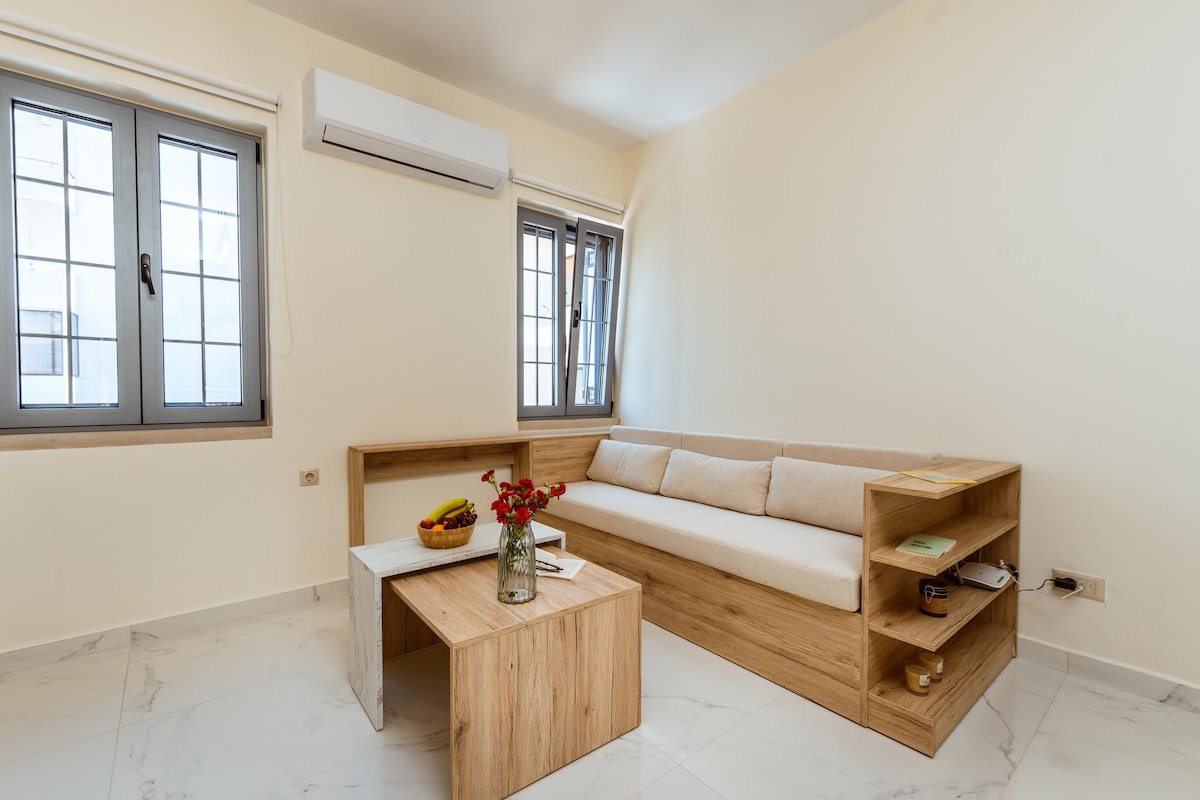 Ви нудиме нов стан со удобна спална соба и салон со мини кујна. Балкон со неверојатен поглед на море. Се наоѓаме на 50 метри од плажата во центарот на Хора сфакион. Ги менуваме крпите на секои два дена. Ги чистиме становите и ги менуваме линиите на креветите на секои четири дена. Станот има два вида перници - повеќе меки и посилни. А тука се и горните делови на душекот. Ако не ви се допаѓаат меки, може да ги оставите топерите или да ми кажете. Имате топла вода 24 часа