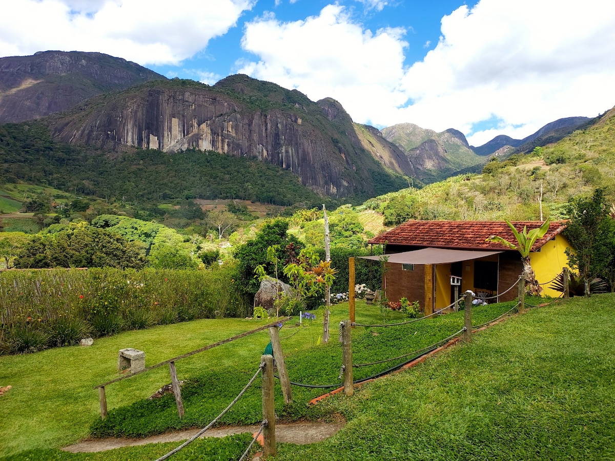 Estamos localizados no Parque Nacional da Serra dos Orgãos, com trilhas para caminhadas junto a natureza, cachoeiras e uma vista exuberante para a montanhas mais lindas do Rio onde temos restaurantes próximos, e sítios vizinhos com vivência camponesa pois é uma região rural com plantações de hortaliças, vc não fica isolado. Chalé com Quarto para casal, cozinha americana, geladeira, fogão, mesa, utensílios domésticos e Ducha externa.