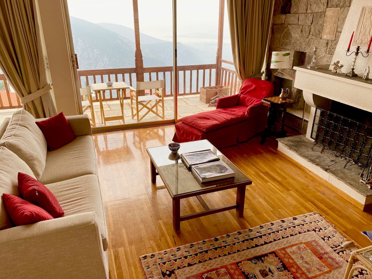 Пентхаус кондоминиум на врвот на ридот кој нуди уникатен панорамски поглед на Коринтскиот Залив и долината на маслиновото дрво во Делфи Оракле! Балконот нуди некои од најдобрите погледи во Делфи, една од најважните и инспиративни долини во Античка Грција! Просторно и удобно, со 2 двојни спални соби, дневна соба, камин, целосно опремена кујна со трпезариски објекти и голема бања! Кондоминиумот ќе биде вашата идеална база за истражување на Делфи и живописните градови Арачова, Галаксиди, Итеа!