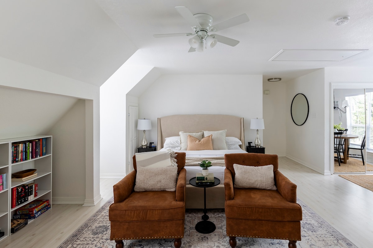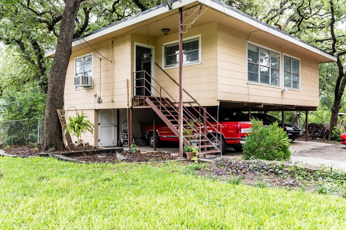 **Ажурирани процедури за чистење за да се исполнат/надминат препораките на ЦКБ ** Сместете се за престој во нашето прибежиште. Оваа приватна гостинска куќа е сместена во шума од стари дабови дрвја, сместена над нашата одвоена гаража. Реновиравме одгоре надолу и се опуштивме во нашиот голем надворешен простор. Во овој тивок дом за гости може да се сместат до 6 лица. Најдобриот дел? Се наоѓаме на 5 минути од центарот на градот и се наоѓаме во центарот на округот Тарант. 20 минути до каде било, вклучувајќи го и аеродромот DFW, стадионот AT&T и TX ренџерите