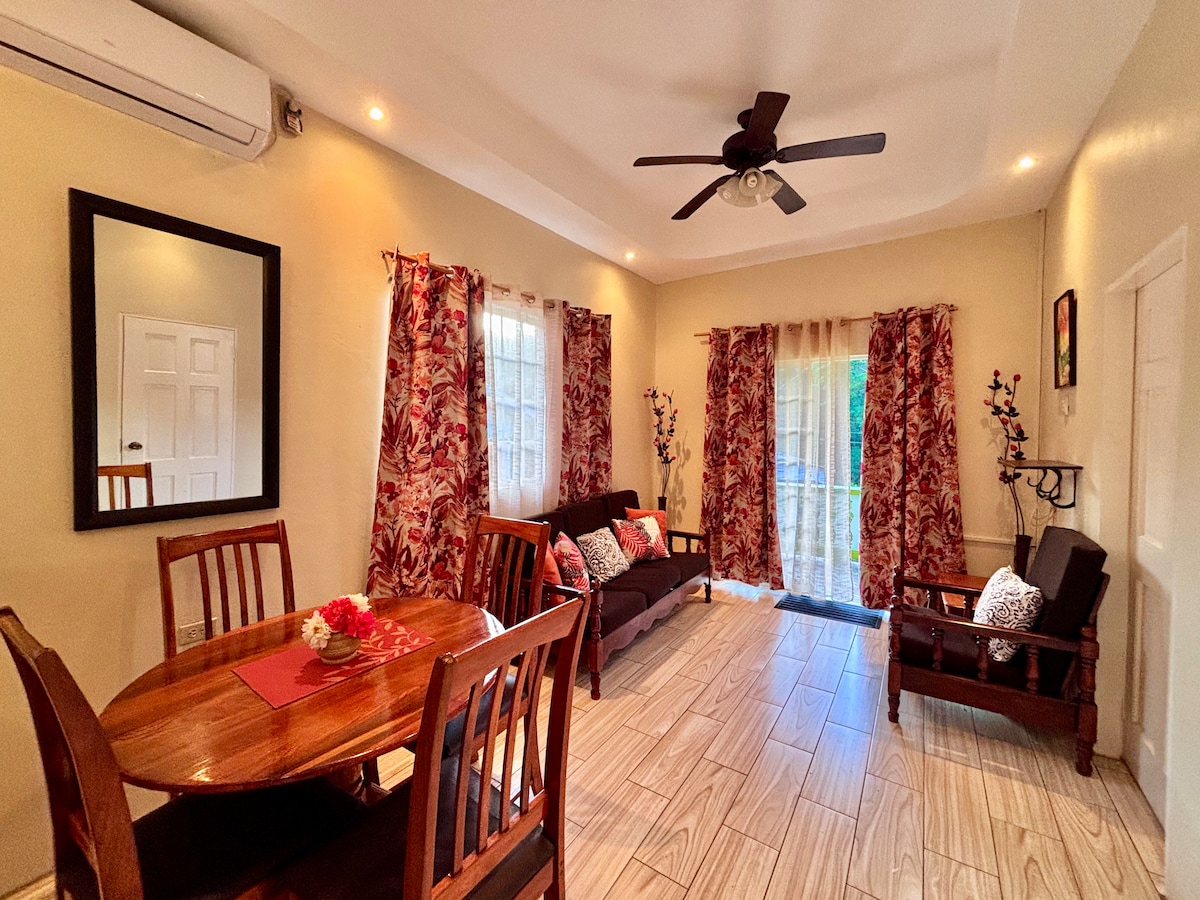 Стан со една спална соба и сопствена бања. Светло декориран, со основни удобности. Погодно е лоциран со лесен пристап до сали за вежбање, савани, а за верските гости има многу места за богослужба. Пристапен е до градот, плажите на северниот брег, планината Сент Бенедикт , засолништето за птици Карони и јужниот дел на Тринидад со јавен превоз. Во просторот може да се сместат 2 лица. Обезбедени се вентилатори. Нема миленичиња. Забрането пушење . Да, топла и ладна вода.
