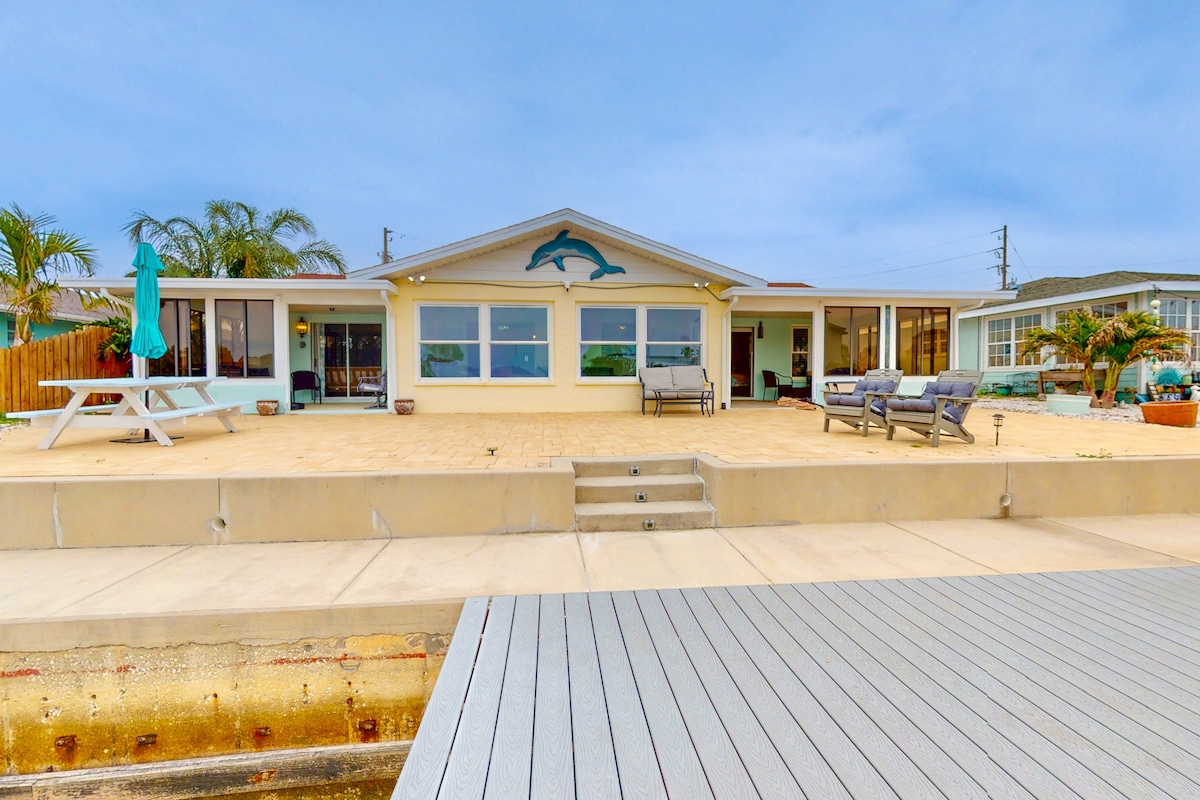 Оаза на брегот со греен базен, док + кајаци! Опуштете се во вашиот приватен базен со греење или риба од приватното пристаниште. Понесете го бродот (до 26’) и крзнените пријатели (мал надоместок). Наполнета кујна, скара (со вклучен пропан), бесплатен кафе бар, машина за конуси за снег и 4 кајака за забава на вода. Отворен план на катот, ненадминлив поглед кон дворот и врвно место за одмор на брегот на Флорида — совршено за семејства, бродари или парови! Не пропуштајте го ова место за одмор на брегот на Флорида со 5 ѕвезди!