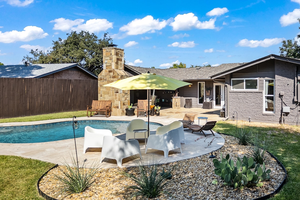 Уживајте во тивко одморалиште во нашиот модерен бунгалов од средниот век во центарот на DFW! Ова е прекрасна локација за истражување на Далас и Форт Ворт или за посета на семејството во регионот. Имаме прекрасен парк на нашата улица каде што децата можат да си играат, голем двор во кој ќе уживаат вашите крзнени пријатели и лесен пристап до централниот автопат што го поврзува Далас со Форт Ворт. Не недостасуваат активности во регионот. Самиот дом е оживеан дом од 1950 година со сите домашни вибрации. Дојдете да престојувате!
