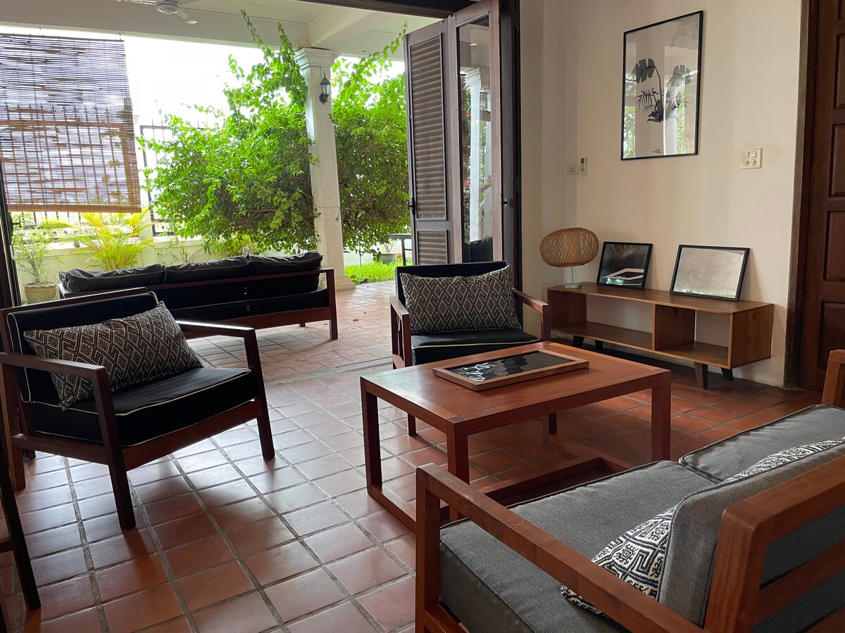 Сместен на брегот на реката Меконг, овој простран стан на приземје во нашиот дом во француски колонијален стил, обезбедува опуштен лаоски начин на живот со модерни удобности. Излезете од целосно климатизираниот стан со 2 спални соби со клима уред за да се опуштите на кауч на терасата со тропска градина или да ги откриете традиционалните лаоски начини на живот на прошетка по руралниот брег на реката (директен пристап од терасата / градината), особено за време на зајдисонцата што ќе ви го одземат здивот.