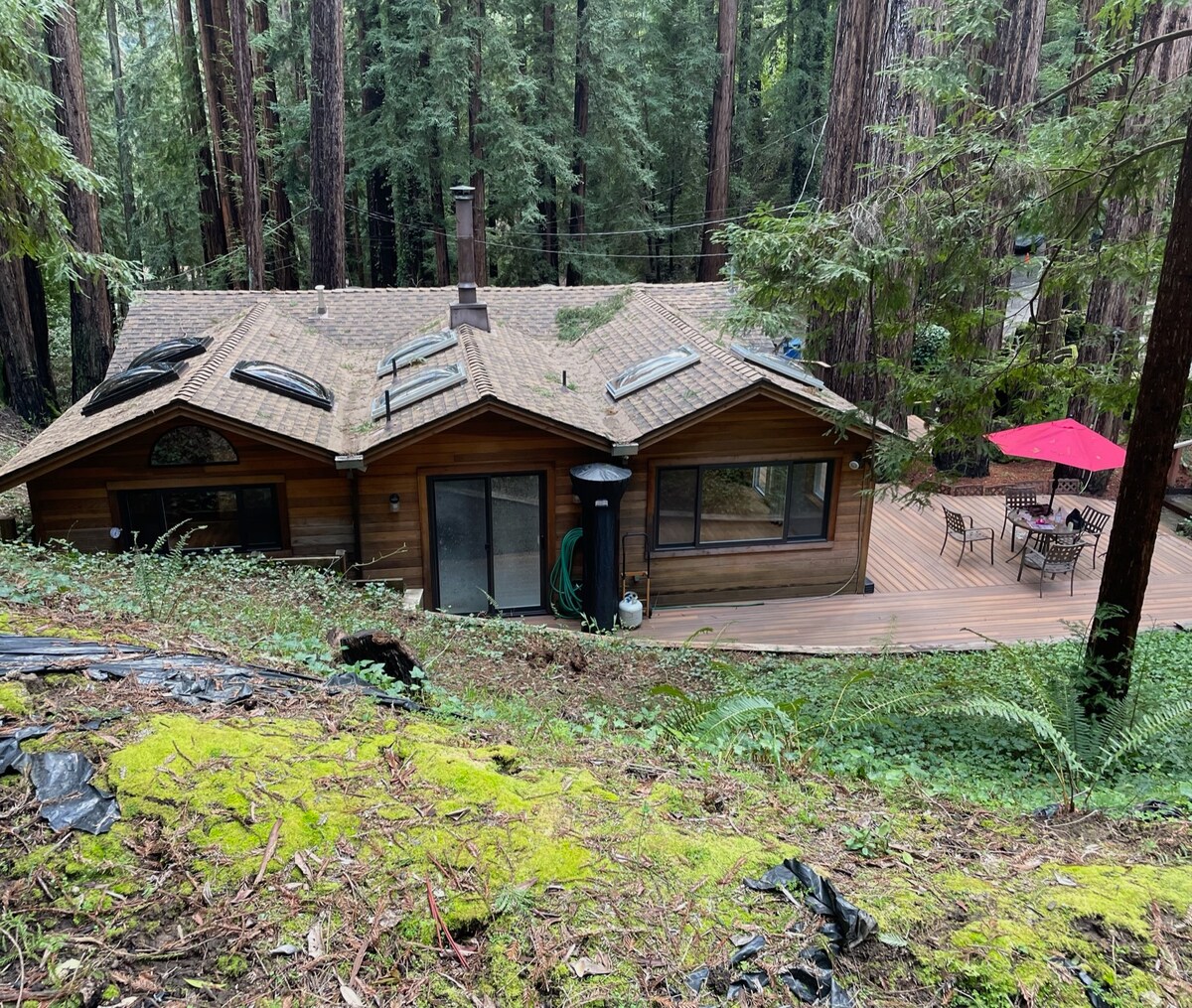 Прочитајте внимателно пред да резервирате 😊 Дозвола 211309. Опуштете се во ова приватно, уникатно и спокојно место за одмор. Оваа модерна планинска дрвена колиба се наоѓа на половина хектар на крајот од приватен пат, опкружена со секвои, со два огромни поплочени дворови кои ја опкружуваат од сите страни. Уживајте во елегантниот ентериер. Опуштете се на пространиот двор со високи секвои во позадина или сместете се покрај огништето и уживајте во ѕвезденото небо. Блиску до центарот и многу атракции во округот Санта Круз.