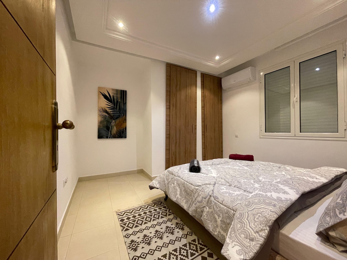 Appartement a quelques mètres de la plus belle plage de Tunisie Deux chambres a coucher open space salon cuisine et une salle de bain avec douche a l'italienne Une chambre a coucher parentale avec un lit queen size et une autre chambre un lit une place Superbe appartement pour séjour estival