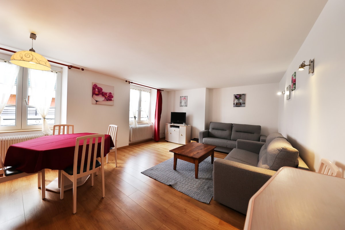 Во центарот на селото ќе најдете прекрасен стан, целосно опремен, простран. Составено од затворена гаража и посебен влез. Горе: туш кабина со туш кабина, спална соба со двоен кревет (160), спална соба со 2 единечни кревета, голема дневна соба, голема комплетно опремена кујна со поглед на тераса на југоисток (мебел за градина, скара на плин,..) Можност за детско креветче и бесплатно високо столче за хранење Бесплатен wifi важно: прочитајте повеќе повратни коментари