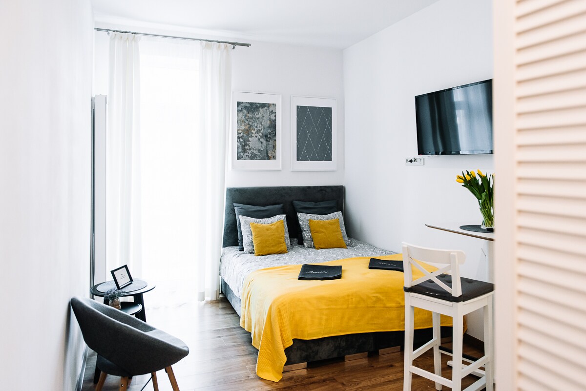 Нашиот стан се наоѓа во Стариот град, во сенката на Вавел Хил - ќе стигнете до замокот за 5 минути, а до главниот плоштад нема да ви одземе повеќе од една четвртина. На враќање може да застанете покрај реката Висла, а навечер да се потопите во магичната атмосфера на областа Казимиерз. А кога ќе ги искористите можностите што ги имате, ќе уживате во спокојството и тишината на станот од страната на градината и во удобноста на стилскиот, климатизиран ентериер.