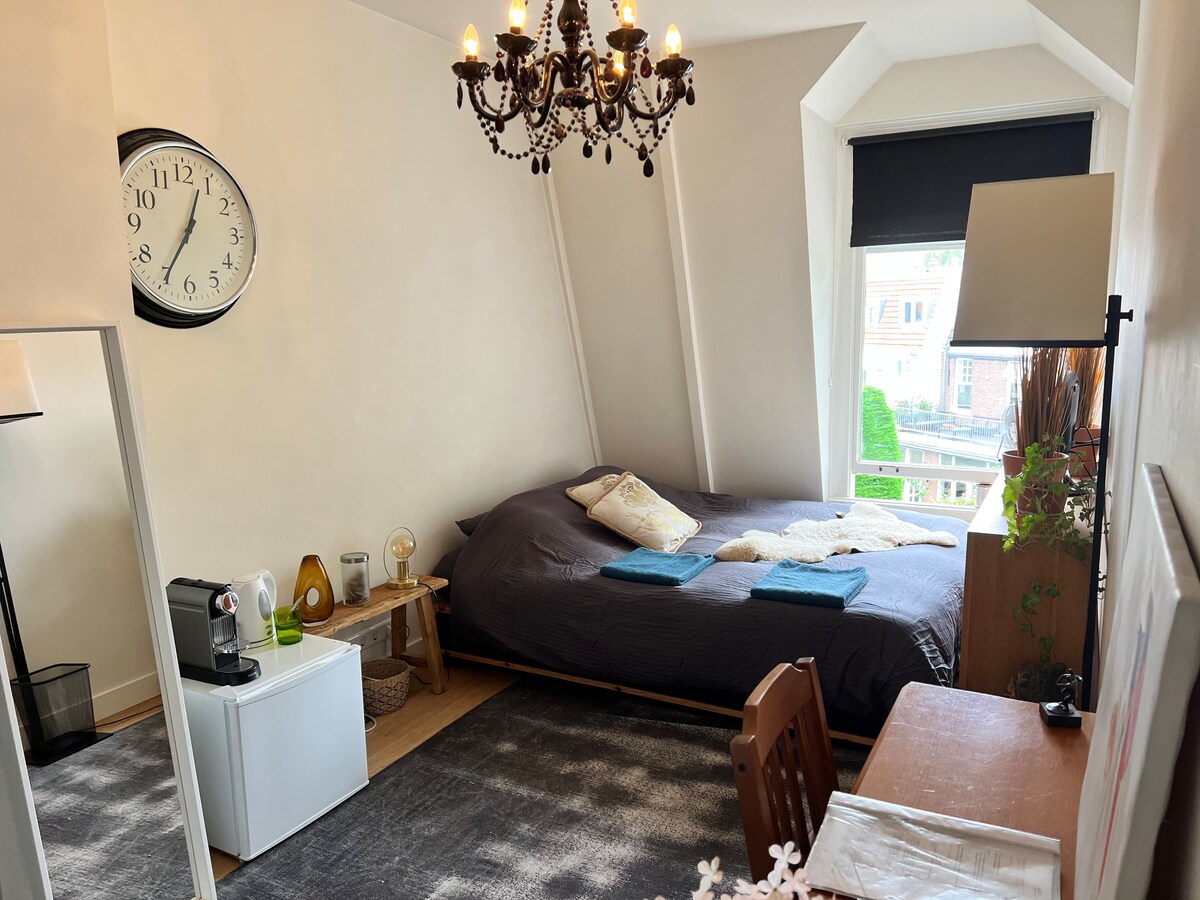 На само 5 минути од центарот на градот Харлем, во удобното, но прилично соседство „Leidsebuurt“ може да најдете целосно реновиран стан во мојата куќа. Гостите имаат посебен влез. Живеам на вториот и третиот кат. Вкупно 50 м2 студио со луксузна приватна бања и бања со бања. Има мала кујничка со фрижидер, рерна/микробранова печка, машина за перење алишта, машина за кафе и електричен шпорет. На 25 км од Амстердам, а плажата и дините се на 7 км. 2 велосипеди достапни бесплатно.
