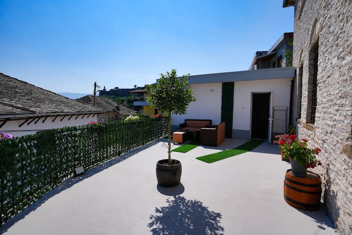 - Сместувања за изнајмување со простор за седење на отворено за одмор во Ѓирокастër