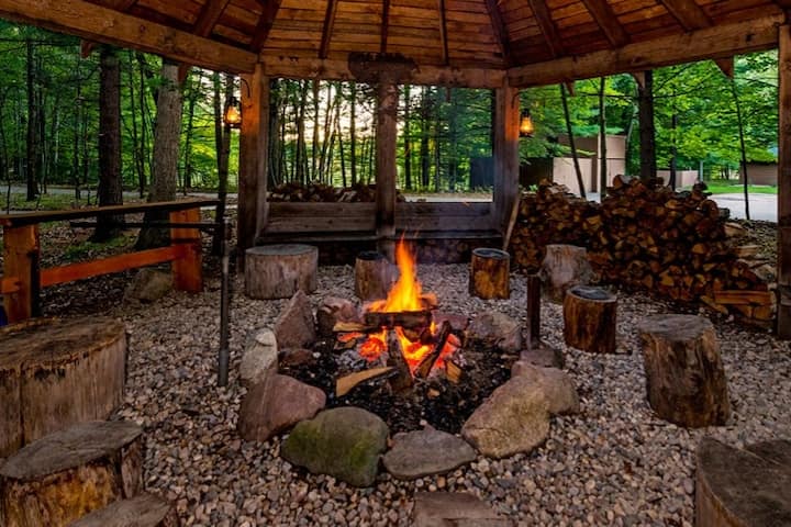 Опкружена со бујна природа, нашата викендичка ви обезбедува доволно простор за да се потопите во спокојство. Во летните месеци уживајте во риболов на нашето приватно езеро со два понтона, обезбедени се осум рибарски столбови или истражете го езерото со нашите четири кајака и две стоечки штици за веслање кои се достапни. Навечер собирајте се околу огнот под ѕвездено небо или уживајте во коктели внатре околу барот. Во текот на зимските месеци уживајте во патеките за пешачење осветлени со фенери околу имотот во чевли за снег што се обезбедени.