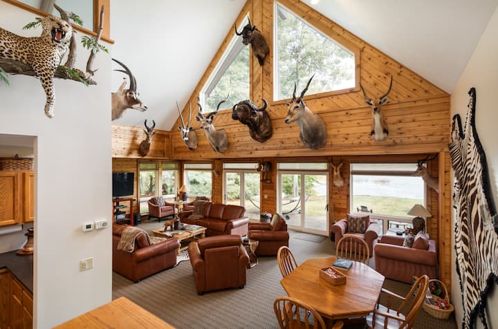 Уживајте во спокојниот амбиент на неверојатна отворена трпезарија, опремена со голем камин. Додека гледате, ќе бидете воодушевени од живописниот поглед на вашето приватно езеро, нашите двајца ќелави орли и ќе бидете опкружени со низа убаво прикажани препарирани животни.