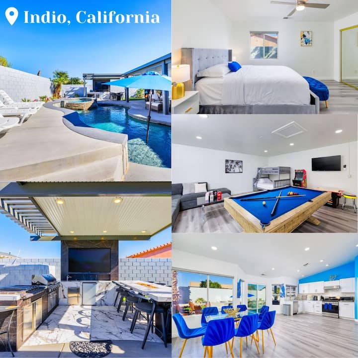 Искусете луксуз во Desert Paradise Retreat во Индио, просторен рај со 5 спални соби и 3 бањи. Уживајте во приватен базен, спа и аркади во нашиот дом од 232 квадратни метри. Совршено за групи, блиску е до Coachella & Stagecoach. Уживајте во нашите скара на отворено, огниште и пространи простории за живеење. СОСЕМА НОВ клима СИСТЕМ КОЈ дува ладен воздух во тие жешки сончеви денови. Неодамна беше инсталирана НОВА ОПРЕМА ЗА БАЗЕН И хлоринатор.
