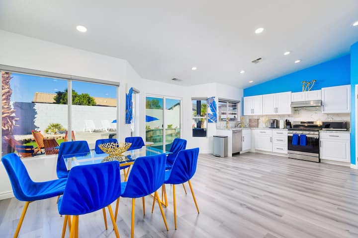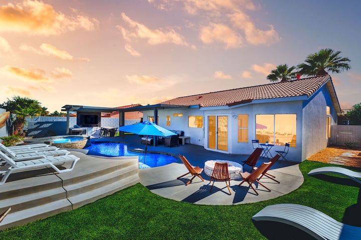 Влезете во светот на луксуз и забава во Desert Paradise Retreat, неверојатна оаза за одмор со 5 спални соби и 3 бањи во срцето на Индио. Ново реновиран за да обезбеди елегантен простор за живеење од 2500 квадратни стапки, овој дом е дизајниран да ги задоволи семејствата, групите и посетителите на фестивалот кои бараат врвно искуство во пустината.
