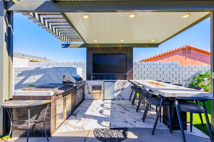 Задниот двор е приватно место за одмор со базен со солена вода и спа центар, кое нуди освежително бегство од пустинските горештини. Надворешниот трпезариски простор со 8 места за седење, скара на плин и остров со висина од бар за 10 лица ги претвора во прослави. Опуштете се на каучот во дворот или соберете се околу огништето под ѕвезденото небо, опкружено со нежно осветлени палми.