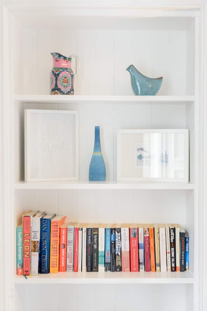 Пространата, добро уредена дневна соба има два традиционални прозорци и прозорци со куфери со поглед на улицата Лејди Лосон, кои внесуваат многу природна светлина. Има прекрасен камин со шарено мексиканско огниште, две удобни каучи во стилот на средината на векот, ретро масичка за кафе G Plan, трпезариска маса и столови, паметен телевизор со Netflix, WIFI и Bluetooth звучник. Кујната е добро снабдена со бесплатни житарки за појадок, млеко, чај и добро кафе и ќе го најдете целиот прибор што ви треба ако сакате да готвите. Светлата главна спална соба со поглед наназад има многу удобен брачен кревет со луксузна постелнина од египетски памук, моќен фен и доволно простор за складирање. Предната втора спална соба има двоен кревет, украсен корнизиран и прекрасен ретро мебел.