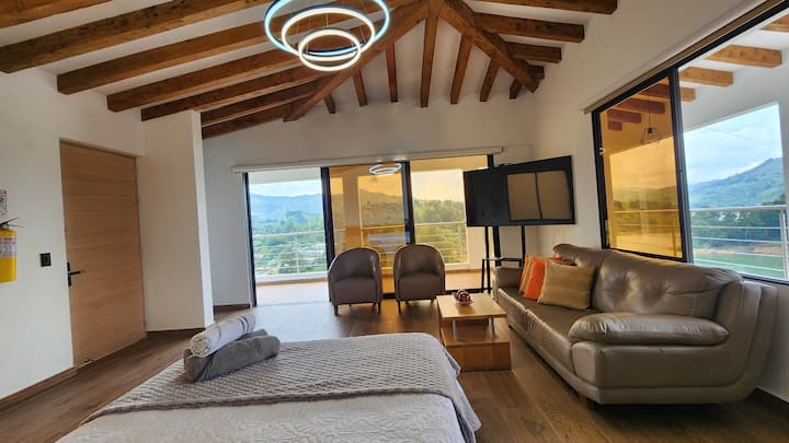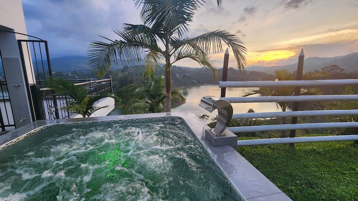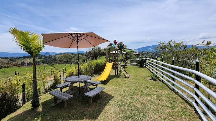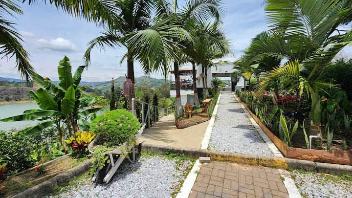 Опкружен со природа на врвот на Ел Пењол, овој уникатен имот нуди тераси со поглед на резервоарот, опремена кујна, заеднички простори идеални за семејства, групи или одморалишта. Самопријавување, wifi, скара и бесплатен паркинг. Џакузито е достапно по резервација (без дополнителни трошоци). На 5 минути од репликата Viejo Peñol и на 20 минути од Piedra y Guatapé. Совршено за исклучување, славење или истражување. Живејте во мир, удобност и незаборавни пејзажи на едно место.
