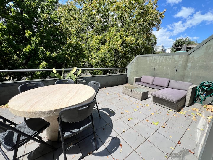 Big Bold Bright 2 level Townhouse со приватна тераса со поглед на St .Kilda Rd. Одличен поглед, совршена позиција и блиску до сè.