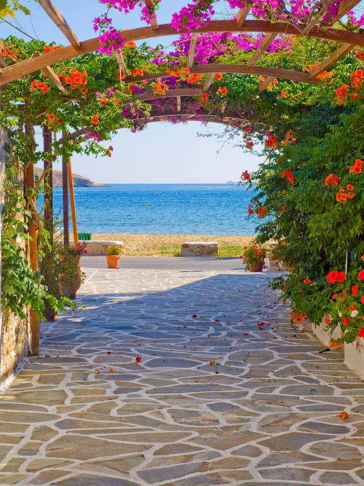 ова неверојатно место се наоѓа точно на песочната плажа на островот Иос, на 300 метри од пристаништето и на помалку од 1 километар (15' пешачење) од центарот на островот!! најдобра локација досега!!