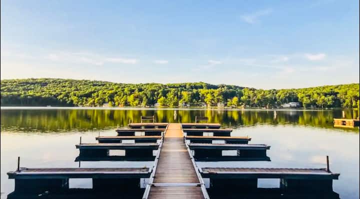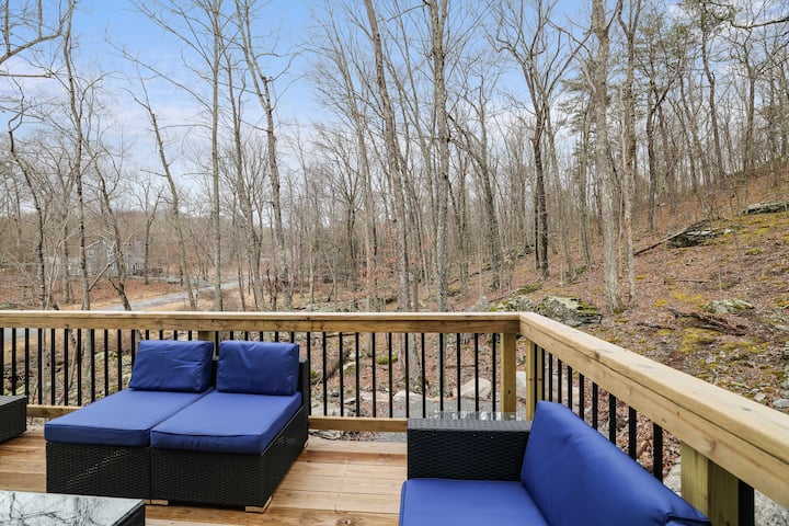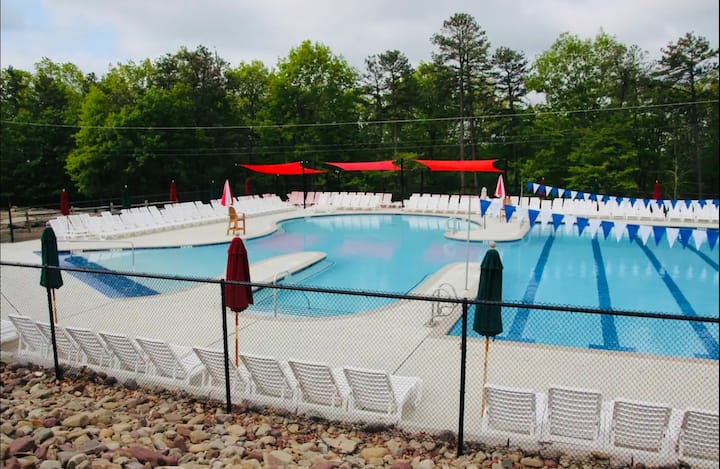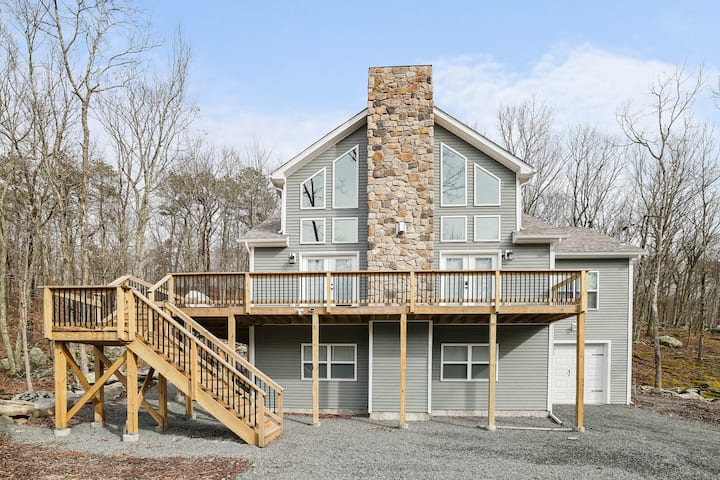 Оваа прекрасна планинска куќа со 5 спални соби/3,5 бањи се наоѓа само на кратка прошетка до езерото и на кратко возење до скијачкиот рид , 2 базена, мини голф, пазарот Мастоп, Summit Bar & Grill и друго! Со широко отворен план на катот, целосно завршена семејна соба/подрум на пониско ниво, високи сводести тавани со тони природна светлина во големата дневна соба И кујната/трпезаријата, 2 спални соби на пониско ниво (едната со брачен/полн кревет (широк 150-179 см), другата со брачен кревет (широк 180-179 см) и брачен кревет (широк 180-179 см), 1 главен апартман на главното ниво, со брачен кревет (широк 180-179 см) и 2 спални соби на горно ниво, и двете со 2 полни кревета поврзани со голема бања Jack-n-Jill, ќе имате простор за групи од сите големини! Има уште многу што да се истражи во срцето на планините Поконо. Нашите зимски гости ќе добијат пропусници за скијачки рид со попуст за лифтот. Нашите летни гости ќе мора да плаќаат $ 10 pp/дневно за сите гости 2 и повеќе за да пливаат. Пропусниците за базен мора да се вратат во полето за оставање на канцеларијата на заедницата пред да заминете или ќе ви биде наплатен надоместок од 75 $.