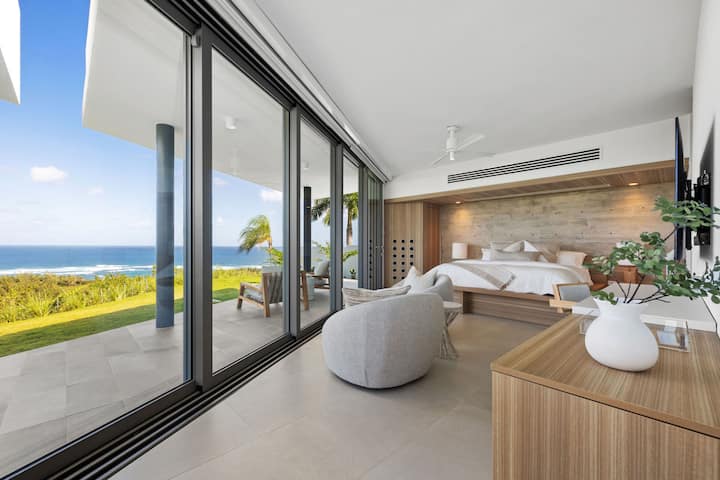 Внатре, секоја од 5-те спални соби е засолниште - поединечно дизајнирано, со сопствени бањи, постелнина со квалитет на спа-центар и тивок клима уред. Гурманската кујна е сон за љубителите на храна, снабдена со сѐ, од капсули Nespresso до професионални садови за готвење. Стаклените врати од подот до таванот предизвикуваат океански ветер и сончева светлина во секој агол.