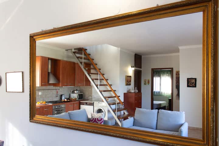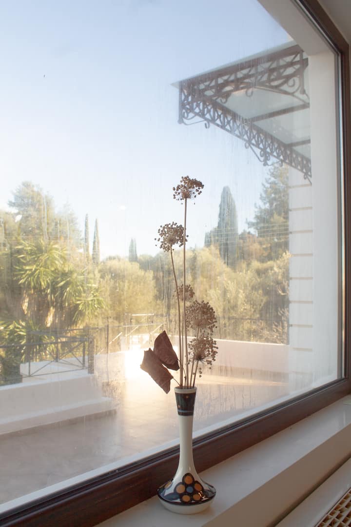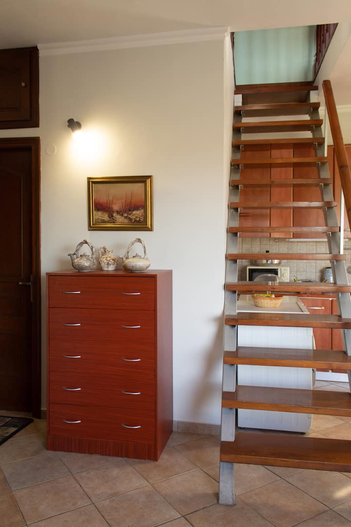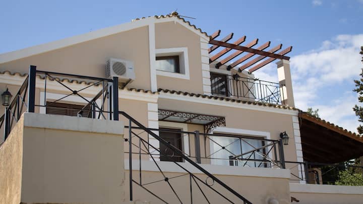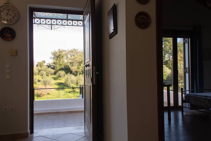 Го зафаќа горниот кат и таванот. Во просторот од 105 квадратни метри може да престојуваат 6 лица со 3 спални соби, комплетно опремена кујна, внатрешни и надворешни простори за јадење, дневна соба, бања, големи тераси со туш, кревети за сончање и балкон со поглед на нашиот имот со маслинови дрвја, до заливот Крф и градот и до палатата Ахилион. Бесплатен паркинг и интернет wifi врска. Целосно е независно со влез за пешачење од паркингот преку скалите и терасата.