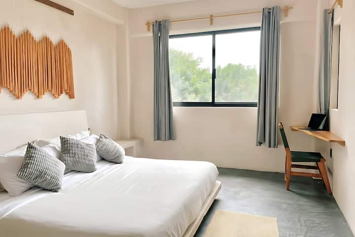 Брачен кревет (широк 150-179 см) со постелнина со врвен квалитет, завеси за затемнување и индивидуален клима уред за удобност. Разбудете се со панорамски поглед на легендарното сурфање Zicatela директно од вашиот кревет.