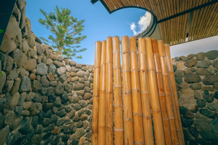 🚿 Бања со „небесен туш“: туш со топла вода и отвор кон небото за поврзување со околината. Обезбедуваме крпи за тело, крпи за раце и сапун.
