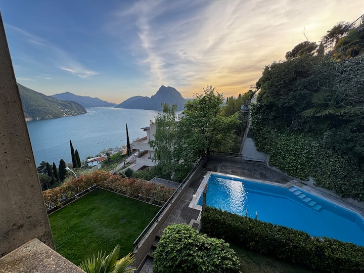 Поглед кон езерото Лугано, базен и фит