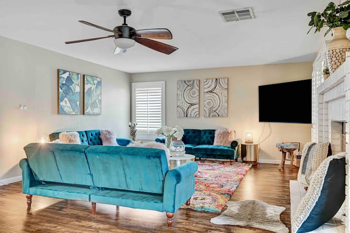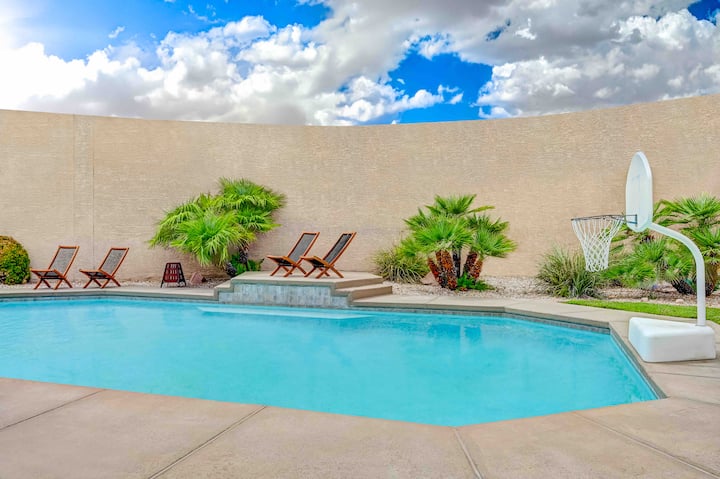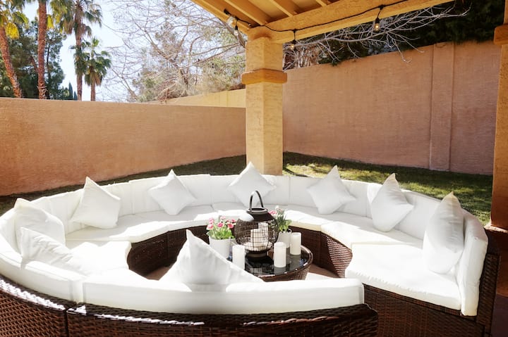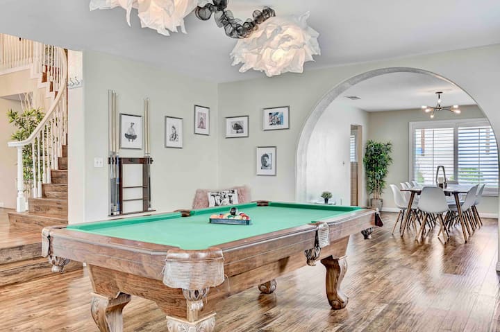 Искусете луксузно живеење во оваа палата со 7 спални соби и 3 бањи (вкупно 8 кревета), на само 12 минути од Појасот. Сместено во тивка уличка, уживајте во гаража за 3 автомобили, греен базен, спа центар и шезлонги. Уживајте во хидромасажната када и тушот на главната бања. Скара на покриениот поплочен двор со вентилатори, додека големиот двор нуди трева, грмушки и дрвја. Забавувајте се во игротеката со маса за билјард. Совршено за семејства или деловни патници. Дезинфицирано за да бидете спокојни.