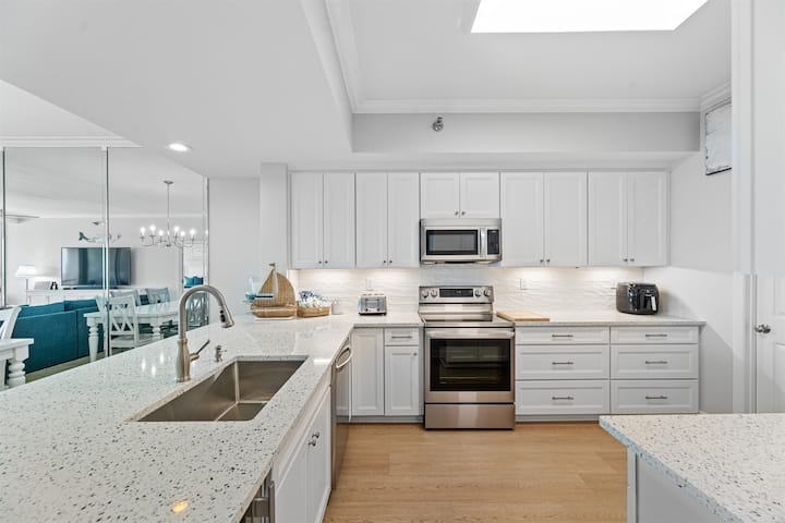 Вашите следни чекори ве носат во целосно реновираната кујна. Поставете ги клучевите на прекрасната нова кварцна плотна која е вградена со рециклирано стакло што одговара на боите на Заливот. Кујната е снабдена со сите сосема нови апарати од не 'рѓосувачки челик, вклучувајќи и погоден фрижидер за пијалаци. Сосема новите шкафови се снабдени со……па, речиси сè што ќе му треба на вашето семејство. Има доволно простор што може да се користи за вашите потреби. Полуостровот беше спуштен до висина која вклучува 4 барски стола за да се овозможи семејно време заедно за време на оброкот и времето за подготовка на ужина. Најдобриот дел од кујната е погледот. Огледалниот одличен ѕид во собата ви дава широк поглед на водата која го вклучува легендарниот кеј Навара.