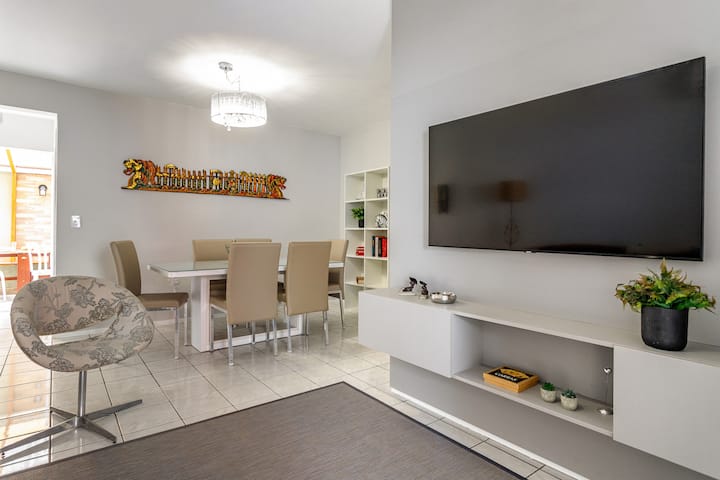 Добре дојдовте на вашето семејно место за одмор во Меја Праја! Овој стан со 3 спални соби, кој е два апартмана, нуди совршена средина за да создадете незаборавни спомени со вашето семејство, на само 280 метри од плажата. Тука, секој детаљ е осмислен за да обезбеди удобност, практичност и посебни моменти. >> Незаборавни доживувања во градината Замислете како подготвувате вкусно скара во нашата градина со покриена пергола, додека децата си играат во надворешниот простор. Скарата е подготвена да ги добие вашите најдобри рецепти, а трпезариската маса може да се постави и во покриениот и во непокриениот простор, што ви овозможува да ја изберете идеалната средина за секоја пригода. Опуштете се во висечката лежалка додека уживате во спокојството на градината или споделете оброк на отворено со вашето семејство, уживајќи во пријатната клима на Меја Праја. >> Удобност и практичност Станот има три спални соби, од кои две се апартмани кои гарантираат приватност и удобност. Еден од апартманите е опремен со 42-инчен паметен телевизор, совршен за релаксирачки моменти, додека другиот апартман нуди приватен балкон за моменти на релаксација. Третата спална соба, со кревет на спрат, е идеална за деца и има работна/студиска маса, обезбедувајќи разновиден простор за различни активности. Простори за семејни собири Во трпезаријата може удобно да се сместат до 6 лица, што ја прави совршено место за семејни оброци. Во дневната соба ве очекува 50-инчен паметен телевизор за семејни филмски сесии, каде што сите можат да се соберат за да гледаат омилен филм или серија по ден полн со авантури. Близина до плажата На само 280 метри од плажата, можете лесно да пешачите до песокот и да уживате во морето. Обезбедуваме две столчиња за плажа и чадор за сонце за ваша удобност, осигурувајќи дека имате сѐ што ви треба за совршен ден покрај морето. Погодност и безбедност Со две места за паркирање едно до друго, едно за мал/среден автомобил и едно за голем автомобил, не мора да се грижите за паркирање. Целосната кујна ви овозможува да ги подготвите омилените оброци, а алиштата со машина за перење и облека во градината нудат дополнителна удобност за време на престојот. Wi-Fi од 500 Mbps гарантира дека секогаш сте поврзани, а клима-уредот во дневната соба обезбедува пријатна средина во секое годишно време. >> За Garden Bnb Нашата компанија, Garden Bnb, е родена во Куритиба, од љубовта кон патувањето и предлогот на Airbnb. Со повеќе од 8 години искуство, многу ни радува што обезбедивме моменти за уживање во животот и создавање поврзаност помеѓу семејството и пријателите. Нашата цел е да понудиме простори кои комбинираат удобност, практичност и посебен допир на добредојде, така што ќе се чувствувате како дома, дури и ако сте далеку од тоа. Овој стан во Меја Праја е идеално место за семејства кои бараат удобност, практичност и посебни моменти заедно. Од градинарски скари до релаксирачки прошетки до плажа, секој ден тука ќе биде нова можност да создадете незаборавни спомени. Дојдете и откријте го сето она што го нуди ова семејно место за одмор! --- Се надеваме дека вие и вашето семејство ќе уживате во прекрасниот престој во нашето приморско одморалиште! ***Белешка: бидејќи се работи за стара зграда со еднофазна електрична мрежа, може да биде можно да се деактивираат прекинувачите во случај тушевите да се поврзани и