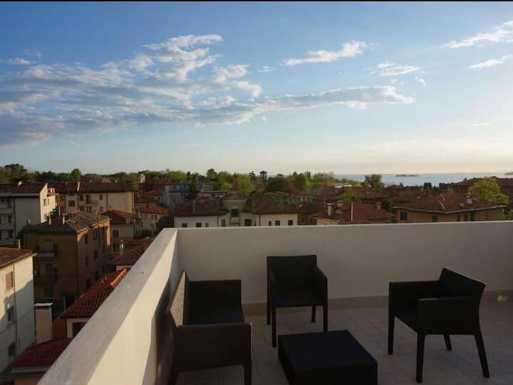 Сместен на прекрасниот остров Лидо ди Венеција, станот се наоѓа на најгорниот кат, со ексклузивни тераси и неверојатен поглед на лагуната и плажата. На неколку минути од палатата на филмскиот фестивал и хотелот