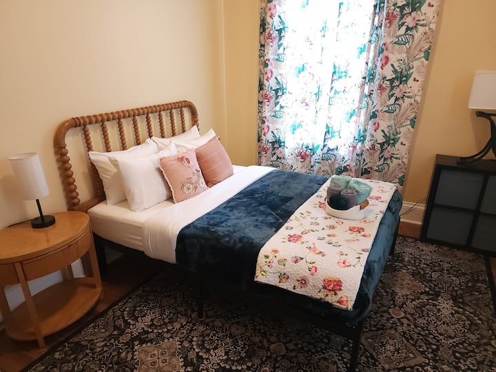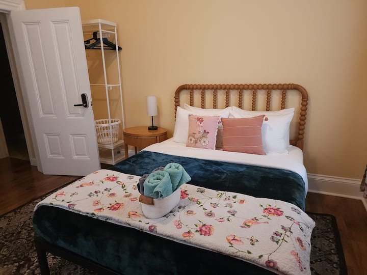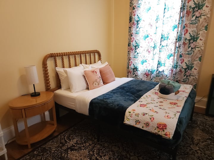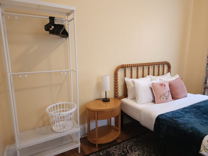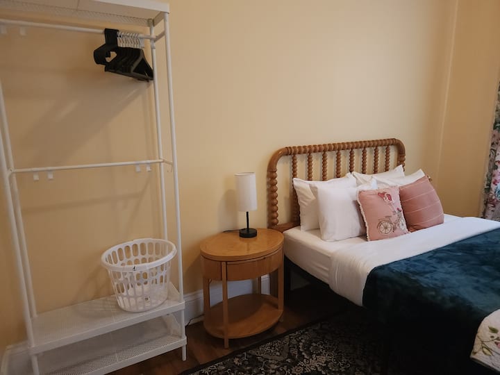 Уживајте во лесен пристап до сѐ од оваа совршено лоцирана почетна база. Овој историски викторијански заеднички дом со 5 спални соби е поделен на два одделни стана. Вашата спална соба е во задниот дел. Ќе делите кујна и бања со патникот/ите во друга спална соба. Оваа соба има брачен кревет (широк 150-179 см), биро, удобен стол и плакар за складирање. Имате еднаков пристап до заедничките простори во домот - кујна, пералница, двор.
