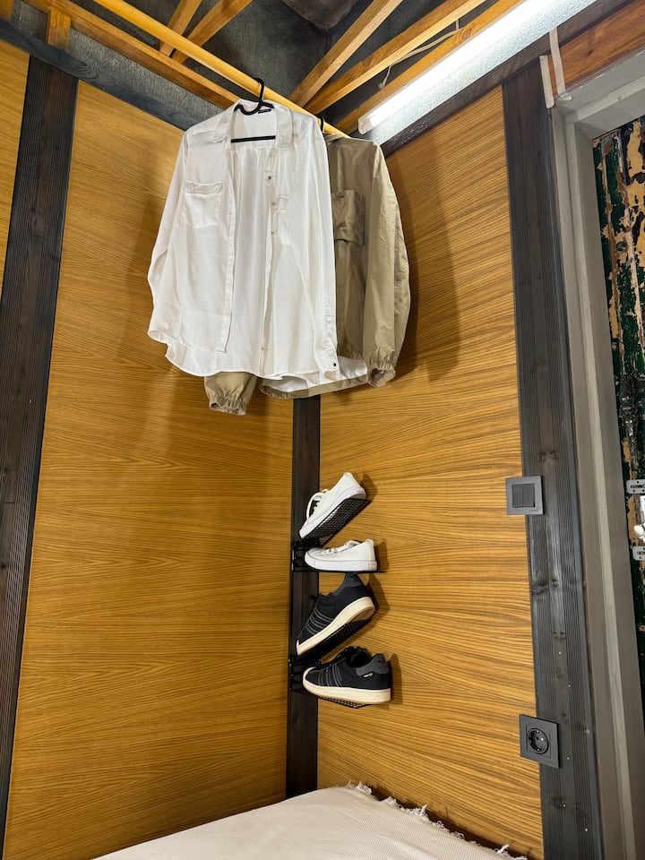 Дрвената колиба е обезбедена со безбедносен сеф, полица за багаж за лесна организација, организатор за чевли и закачалка за вашата облека.