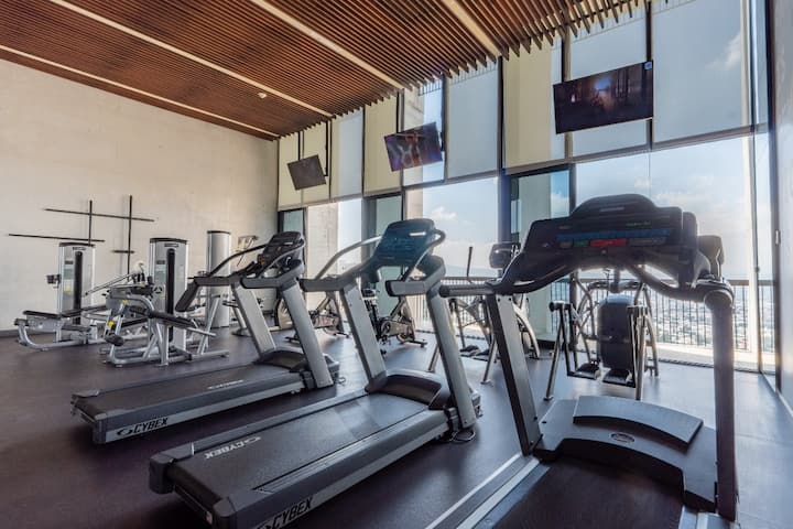 За вежбање ви се достапни следниве удобности: лента за трчање, статичен велосипед и тегови.