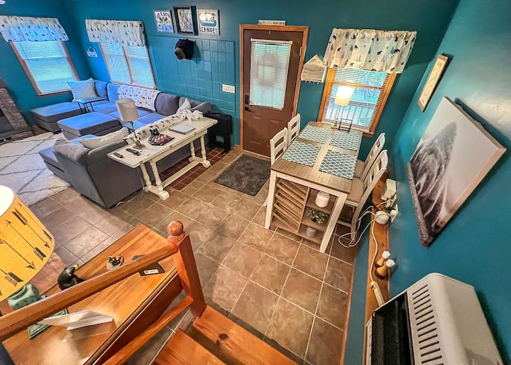 Додека влегувате внатре, ќе најдете привлечен простор за седење и јадење со кауч, електричен камин и паметен телевизор со рамен екран. Има и трпезариска маса за шест лица. Неколку чекори погоре, кујничката е опремена со дополнителен фрижидер, микробранова печка и машина за кафе Keurig.