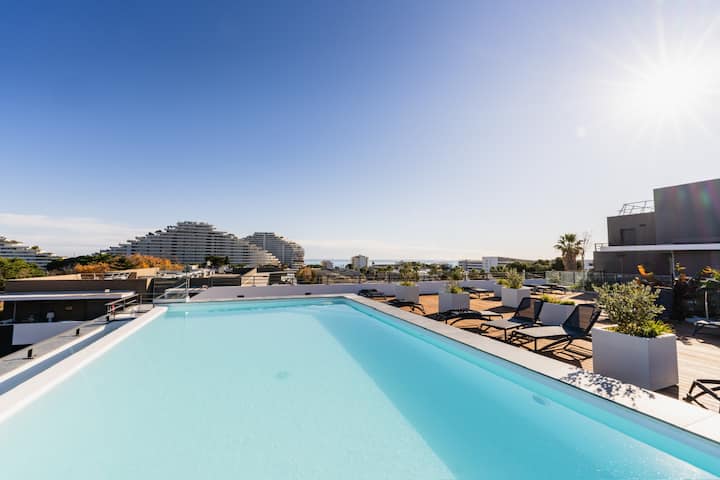 Поглед кон морето и базен на покривот – заливот Јам