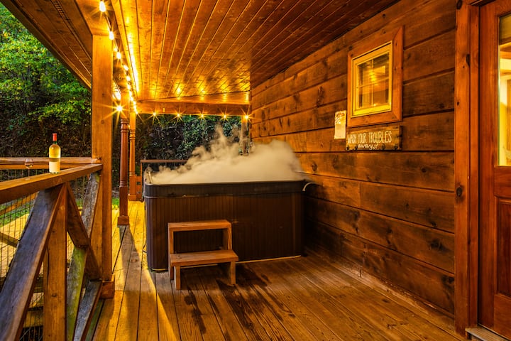 Дрвена колиба, хидромасажна када, огниште, Роринг Крик