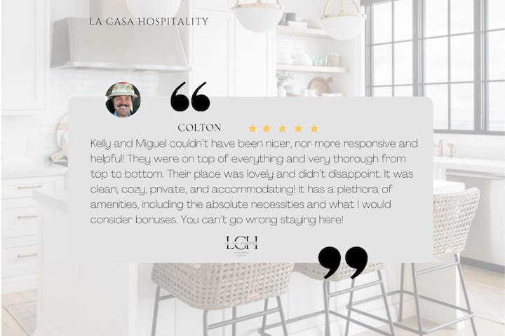 Ние сме Кели и Мигел, двојката сопруга и сопруг зад La Casa Hospitality. Угостуваме повеќе од пет години и сакаме да создаваме внимателни и удобни сместувања за нашите гости. Ги учам нашите две деца додека Мигел работи со полно работно време. Во слободното време, уживаме да патуваме како семејство и да наоѓаме инспирација за нашите домови. Многу сме им благодарни на сите кои резервираат кај нас или го додаваат нашиот оглас на нивната листа на „Омилени“. Со нетрпение очекуваме да ве угостиме!