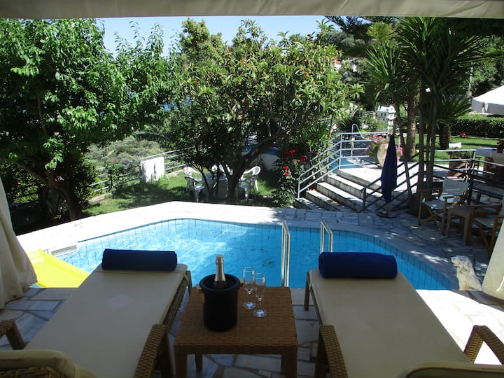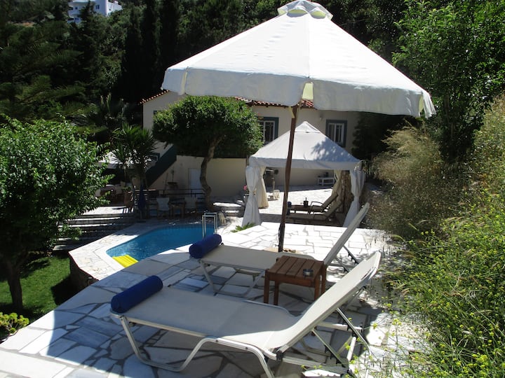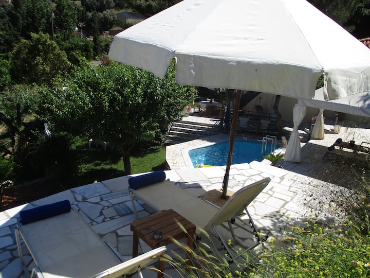 Градинарска вила со приватен базен и поглед на море.
