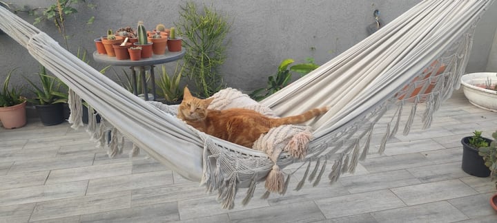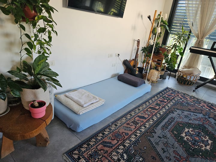 Добре дојдовте во мојот удобен дом во срцето на Шапира, Тел Авив! Овој светол, двокатен стан е полн со растенија и добра атмосфера, со прекрасен балкон за опуштање. Ќе го делите просторот со мене, со други гости и со мојата слатка црвена мачка, Пучи, која можеби ќе побара да влезе или да излезе. Од безбедносни причини, има мамад (безбедна соба). Куќата ја одржувам чиста, мирна и пријатна и со задоволство ги споделувам моите омилени места во околината. Едвај чекам да ве угостам и да ви помогнам да го направите престојот неверојатен!