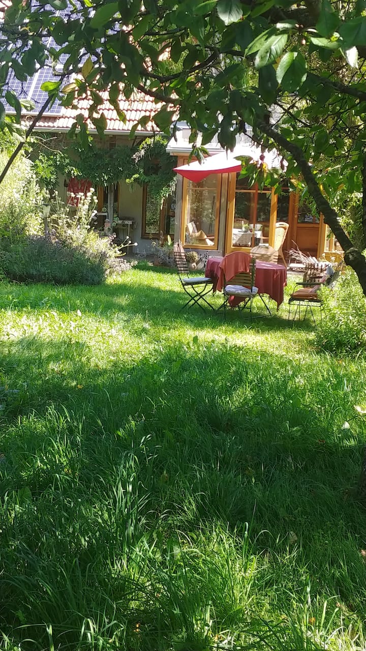 За нас е важно нежно да го користиме потенцијалот на природата, поради што нашата куќа живее од геотермална енергија од 2002 година и од соларна енергија од 2010 година. Во градината влегува само дождовна вода.