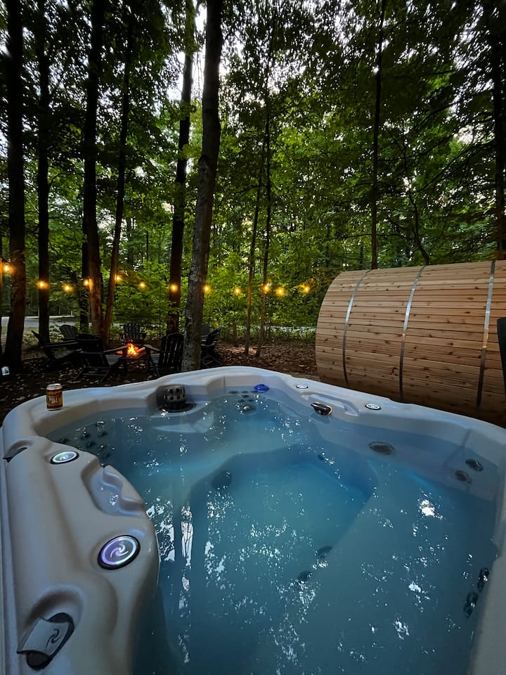 ✹ Неверојатен надворешен простор со хидромасажна када, сауна во форма на буре, огниште и прекрасни светилки
