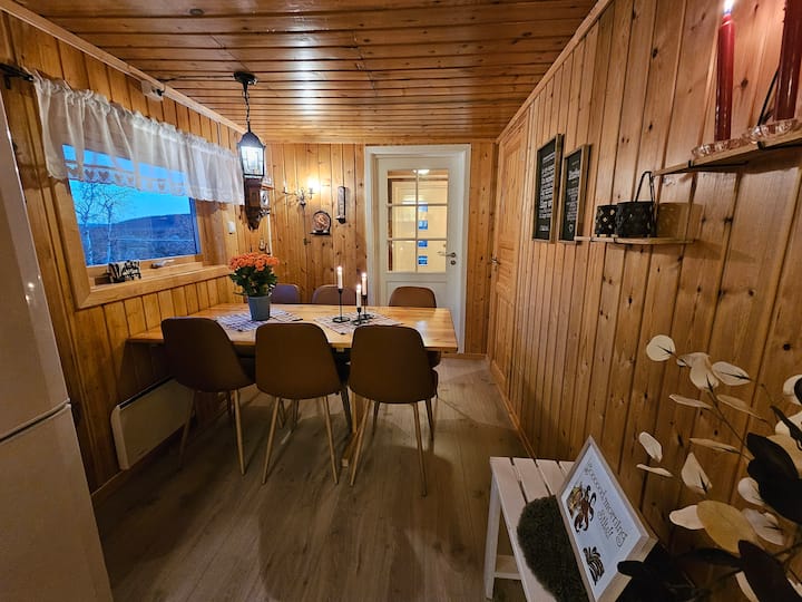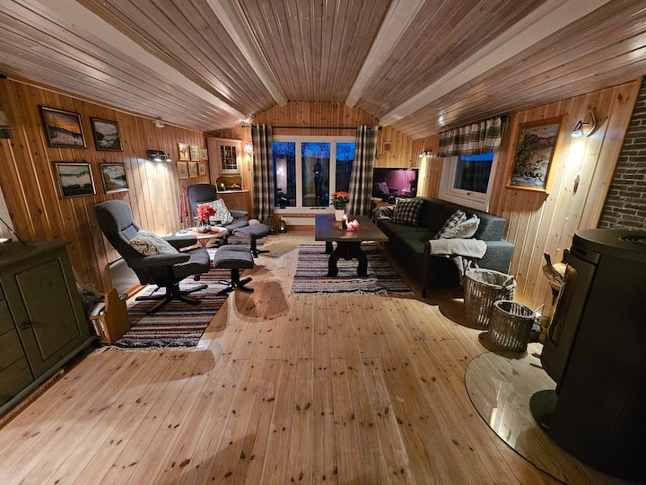 Дрвената колиба има 7 кревета, како и кауч на спуштање во дневната соба за двајца. Уживајте во добри вечери во или надвор во големиот простор за скара.