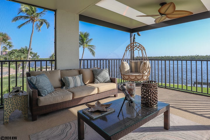 НАЈДОБРАТА КАРАКТЕРИСТИКА НА ОВОЈ НЕВЕРОЈАТЕН КОНДОМИНИУМ ЗА ОДМОР Е ПРИКАЖАНИОТ ВО ЛАНАИ. Надвор од дневниот простор преку лизгачки стаклени врати се наоѓа фантастичниот Screened во Ланаи кој нуди спектакуларен поглед на вода на заливот и бродовите што минуваат на пат кон Заливот. Преубавиот мебел за поплочен двор овозможува јадење и забава на отворено - удобни каучи, ОГРОМЕН телевизор, фрижидер за вино и прекрасна маса и столови за 6 лица. Има дури и голем висечки лулашки кој сигурно ќе ви биде омилено место за опуштање со часови читајќи книга или само гледајќи ги делфините како си играат и бродовите како поминуваат на пат кон Заливот. Ништо слично на овој величествен поглед на брегот од милион долари! И нема ништо подобро од тропски ветер за да се опуштите!